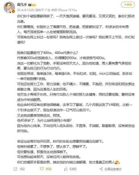 亏了480万后,留几手没有一蹶不振,他表示:“当这一切都化为了泡影,手哥没有怨天尤人,因为他知道,男人要有勇气承担后果,要为自己的行为付出代价。”